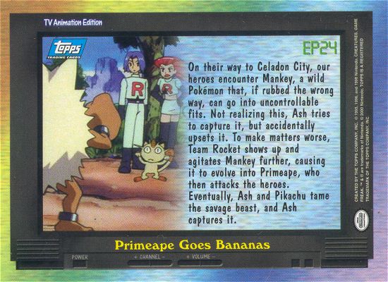 On their way to Celadon City, our heroes encounter Mankey, a wild Pokémon that, if rubbed the wrong way, can go into uncontrollable fits. Not realizing this, Ash tries to capture it, but accidentally upsets it. To make matters worse, Team Rocket shows up and agitates Mankey further, causing it to evolve into Primeape, who then attacks the heroes. Eventually, Ash and Pikachu tame the savage beast, and Ash captures it.