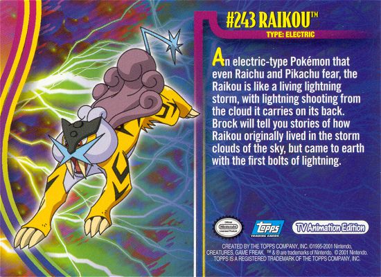 An electric-type Pokémon that even Raichu and Pikachu fear, the Raikou is like a living lightning storm, with lightning shooting from the cloud it carries on its back. Brock will tell you stories of how Raikou originally lived in the storm clouds of the sky, but came to earth with the first bolts of lightning.