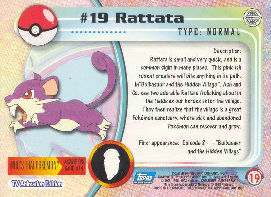 Rattata is small and very quick, and is a common sight in many places. This pink-ish rodent creature will bite anything in its path. In “Bulbasaur and the Hidden Village,” Ash and Co. see two adorable Rattata frolicking about in the fields as our heroes enter the village. They then realize that the village is a great Pokémon sanctuary, where sick and abandoned Pokémon can recover and grow.