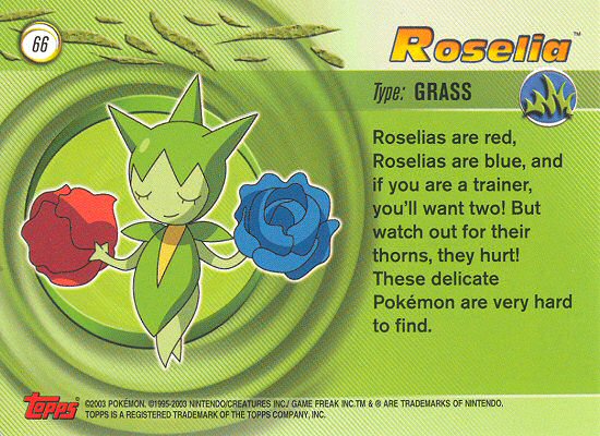 Roselias are red, Roselias are blue, and if you are a trainer, you’ll want two! But watch out for their thorns, they hurt! These delicate Pokémon are very hard to find.