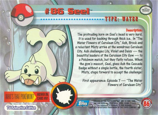 The protruding horn on Seel’s head is very hard. It is used for bashing through thick ice. In “The Water Flowers of Cerulean City,” Ash, Brock and a reluctant Misty arrive at the wondrous Cerulean City. Ash challenges Lily, Violet and Daisy — the beautiful leaders of the Cerulean City Gym — to a Pokémon match, but they flatly refuse. When the Gym’s mascot, Seel, gives Ash the Cascade Badge without a single battle, the fourth sister, Misty, steps forward to accept the challenge!