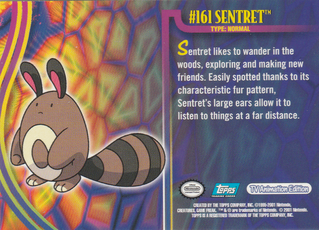 Sentret likes to wander in the woods, exploring and making new friends. Easily spotted thanks to its characteristic fur pattern, Sentret’s large ears allow it to listen to things at a far distance.
