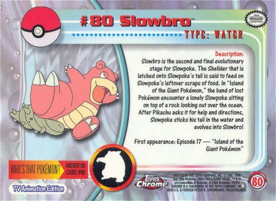 Slowbro is the second and final evolutionary stage for Slowpoke. The Shellder that is latched on to Slowpoke’s tail is said to feed on Slowpoke’s leftover scraps of food. In “Island of the Giant Pokémon,” the band of lost Pokémon encounter a lonely Slowpoke sitting on top of a rock looking out over the ocean. After Pikachu asks it for help and directions, Slowpoke sticks its tail in the water evolves into Slowbro!