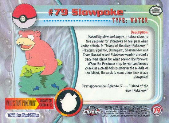 Incredibly slow and dopey, it takes close to five seconds for Slowpoke to feel pain when under attack. In “Island of the Giant Pokémon,” Pikachu, Squirtle, Bulbasaur, Charmander and Team Rocket’s lost Pokémon wander around a deserted island for what seems like forever. When the Pokémon stop to rest and have a snack at a small deli counter in the middle of the island, the cook is none other than a lazy Slowpoke!
