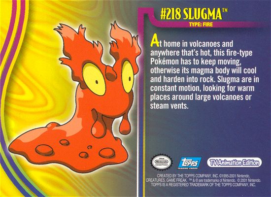At home in volcanoes and anywhere that’s hot, this fire-type Pokémon has to keep moving, otherwise its magma body will cool and harden into rock. Slugma are in constant motion, looking for warm places around large volcanoes or steam vents.