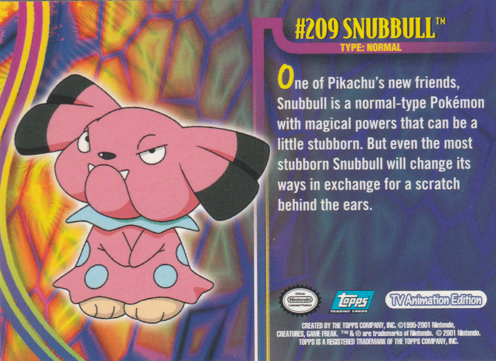 One of Pikachu’s new friends, Snubbull is a normal-type Pokémon with magical powers that can be a little stubborn. But even the most stubborn Snubbull will change its ways in exchange for a scratch behind the ears.