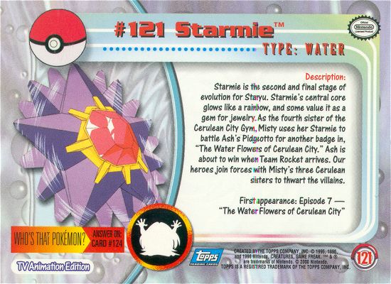 Starmie is the second and final stage of evolution for Staryu. Starmie’s central core glows like a rainbow, and some value it as a gem for jewelry. As the fourth sister of the Cerulean City Gym, Misty uses her Starmie to battle Ash’s Pidgeotto for another badge in, “The Water Flowers of Cerulean City.” Ash is about to win when Team Rocket arrives. Our heroes join forces with Misty’s three Cerulean sisters to thwart the villains.