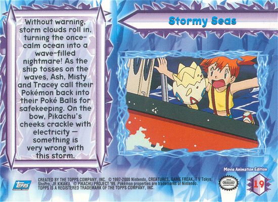 Without warning, storm clouds roll in, turning the once-calm ocean into a wave-filled nightmare! As the ship tosses on the waves, Ash, Misty and Tracey call their Pokémon back into their Poké Balls for safekeeping. On the bow, Pikachu’s cheeks crackle with electricity — something is very wrong with this storm.