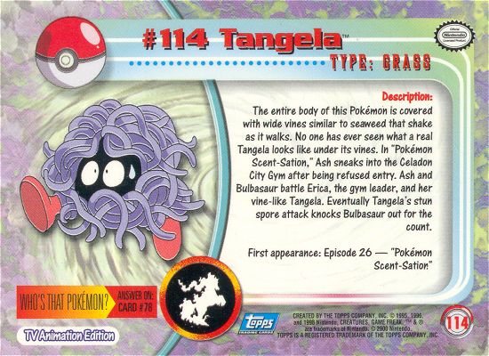 The entire body of this Pokémon is covered with wide vines similar to seaweed that shake as it walks. No one has ever seen what a real Tangela looks like under its vines. In “Pokémon Scent-Sation,” Ash sneaks into the Celadon City Gym after being refused entry. Ash and Bulbasaur battle Erica, the gym leader, and her vine-like Tangela. Eventually Tangela’s stun spore attack knocks Bulbasaur out for the count.