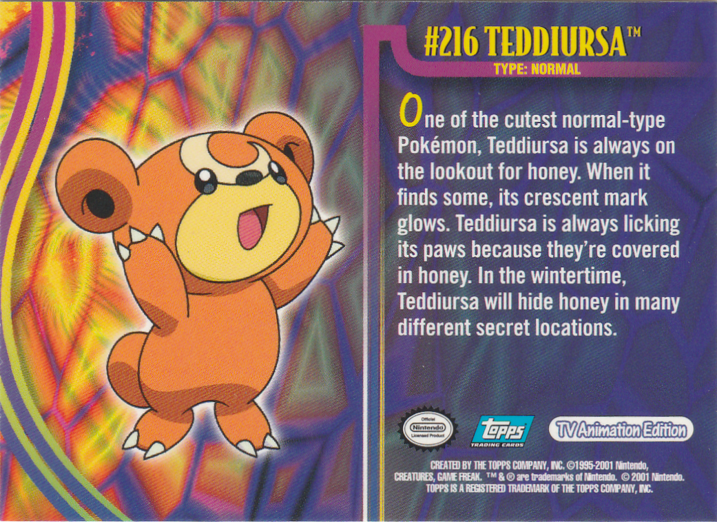 One of the cutest normal-type Pokémon, Teddiursa is always on the lookout for honey. When it finds some, its crescent mark glows. Teddiursa is always licking its paws because they’re covered in honey. In the wintertime, Teddiursa will hide honey in many different secret locations.