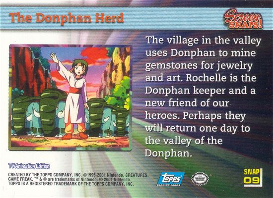 The village in the valley uses Donphan to mine gemstones for jewelry and art. Rochelle is the Donphan keeper and a new friend of our heroes. Perhaps they will return one day to the valley of the Donphan.