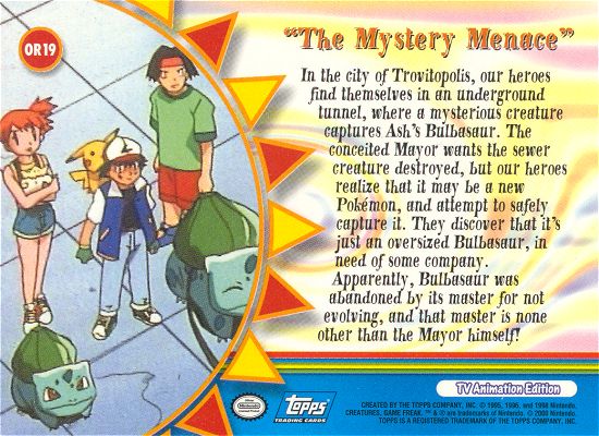 In the city of Trovitopolis, our heroes find themselves in an underground tunnel, where a mysterious creature captures Ash’s Bulbasaur. The conceited Mayor wants the sewer creature destroyed, but our heroes realize that it may be a new Pokémon, and attempt to safely capture it. They discover that it’s just an oversized Bulbasaur, in need of some company. Apparently, Bulbasaur was abandoned by its master for not evolving, and that master is none other than the Mayor himself!