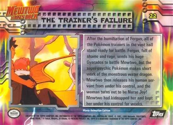 After the humiliation of Fergus, all of the Pokémon trainers in the vast hall stand ready for battle. Fergus, full of shame and rage, sends his huge Gyarados to battle Mewtwo, but the super-psychic Pokémon makes short work of the monstrous water dragon. Mewtwo then releases his human servant from under his control, and the woman turns out to be Nurse Joy! Mewtwo had kidnapped her and kept her under his control for weeks.