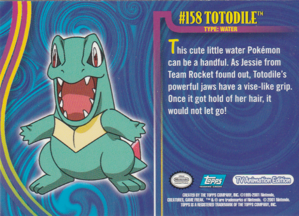 This cute little water Pokémon can be a handful. As Jessie from Team Rocket found out, Totodile’s powerful jaws have a vise-like grip. Once it got hold of her hair, it would not let go!