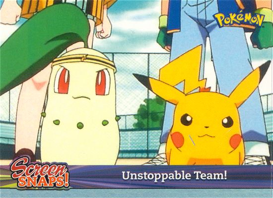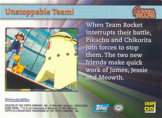 When Team Rocket interrupts their battle, Pikachu and Chikorita join forces to stop them. The two new friends make quick work of James, Jessie and Meowth.