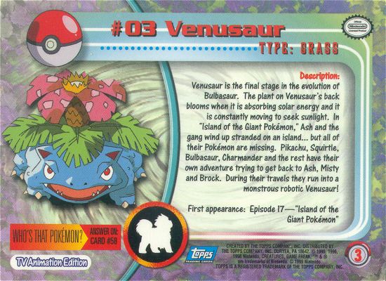 Venusaur is the final stage in the evolution of Bulbasaur. The plant on Venusaur’s back blooms when it is absorbing solar energy and it is constantly moving to seek sunlight. In “Island of the Giant Pokémon,” Ash and the gang wind up stranded on an island… but all of their Pokémon are missing. Pikachu, Squirtle, Bulbasaur, Charmander and the rest have their own adventure trying to get back to Ash, Misty and Brock. During their travels they run into a monstrous robotic Venusaur!