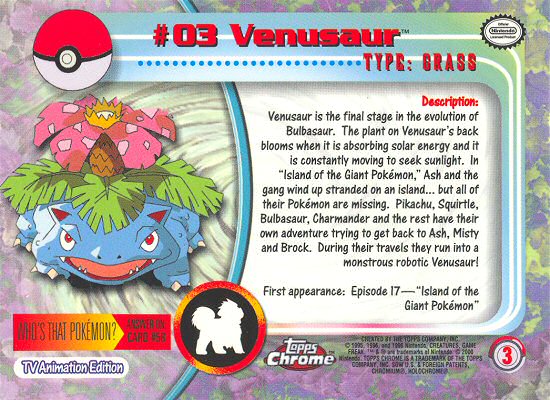 Venusaur is the final stage in the evolution of Bulbasaur. The plant on Venusaur’s back blooms when it is absorbing solar energy and it is constantly moving to seek sunlight. In “Island of the Giant Pokémon,” Ash and the gang wind up stranded on an island… but all of their Pokémon are missing. Pikachu, Squirtle, Bulbasaur, Charmander and the rest have their own adventure trying to get back to Ash, Misty and Brock. During their travels they run into a monstrous robotic Venusaur!
