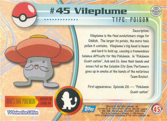 Vileplume is the final evolutionary stage for Oddish. The larger its petals, the more toxic pollen it contains. Vileplume’s big head is heavy and hard to hold up, causing a tremendous balance difficulty for this Pokémon. In “Pokémon Scent-sation,” Ash and Co. have their hands and noses full as the Celadon City Gym/ Perfumery goes up in smoke at the hands of the nefarious Team Rocket.
