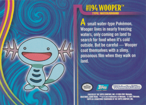 A small water-type Pokémon, Wooper lives in nearly freezing waters, only coming on land to search for food when it’s cold outside. But be careful — Wooper coat themselves with a slimy, poisonous film when they walk on land.