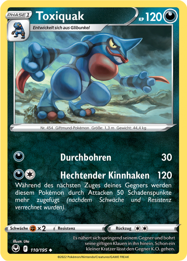 | Kaufen? | Kaufen Sie Ihre Toxiquak Pokemon-Karte aus dem Silberne Sturmwinde-Erweiterung. |