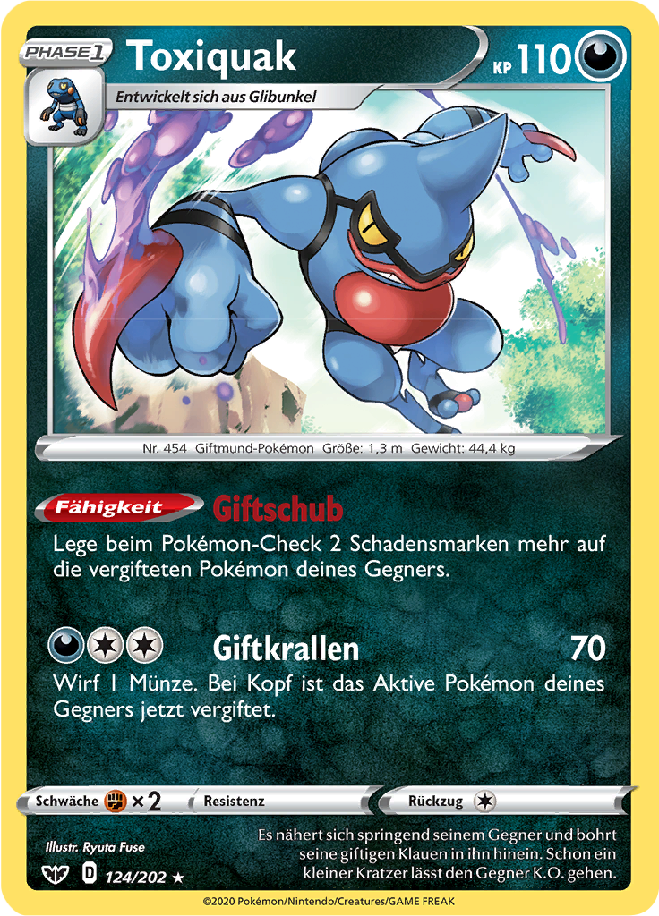 | Kaufen? | Kaufen Sie Ihre Toxiquak Pokemon-Karte aus dem Schwert & Schild-Erweiterung. |