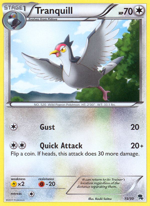 | Kaufen? | Kaufen Sie Ihre Tranquill Pokemon-Karte aus dem BW Trainer Kit Zoroark-Erweiterung. |
