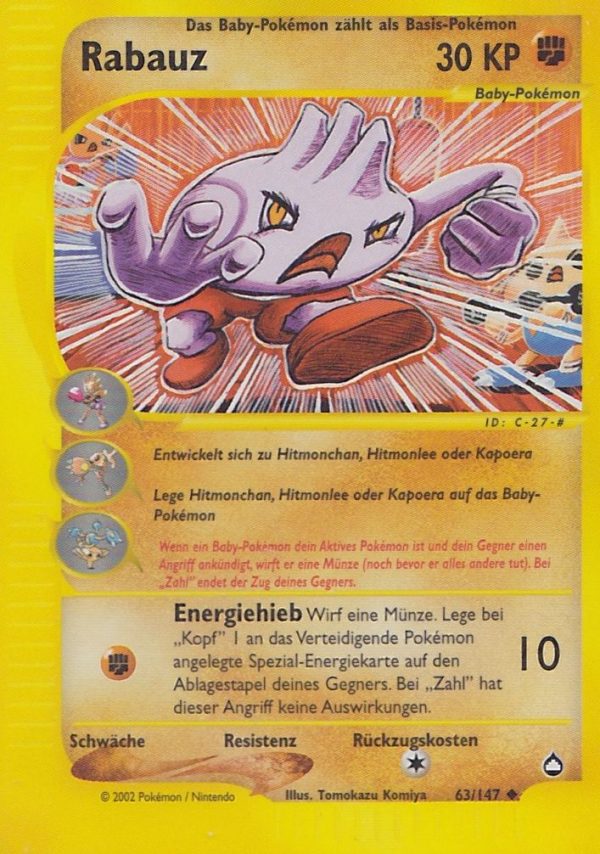 | Kaufen? | Kaufen Sie Ihre Rabauz Pokemon-Karte aus dem Aquapolis-Erweiterung. |