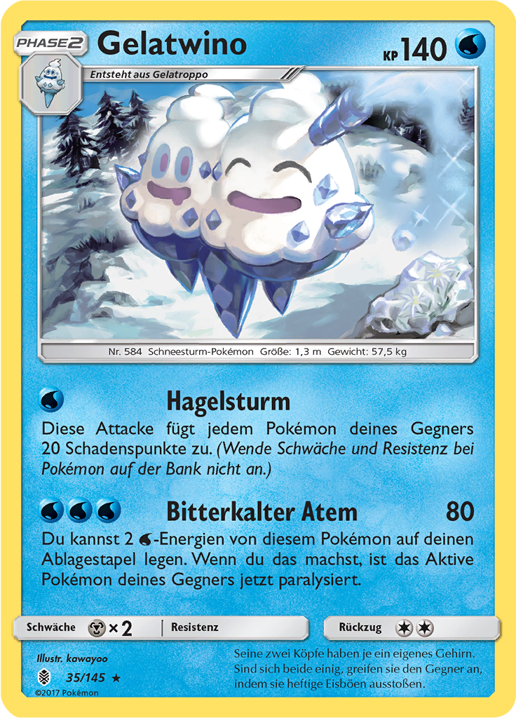 | Kaufen? | Kaufen Sie Ihre Gelatwino Pokemon-Karte aus dem Stunde der Wächter-Erweiterung. |