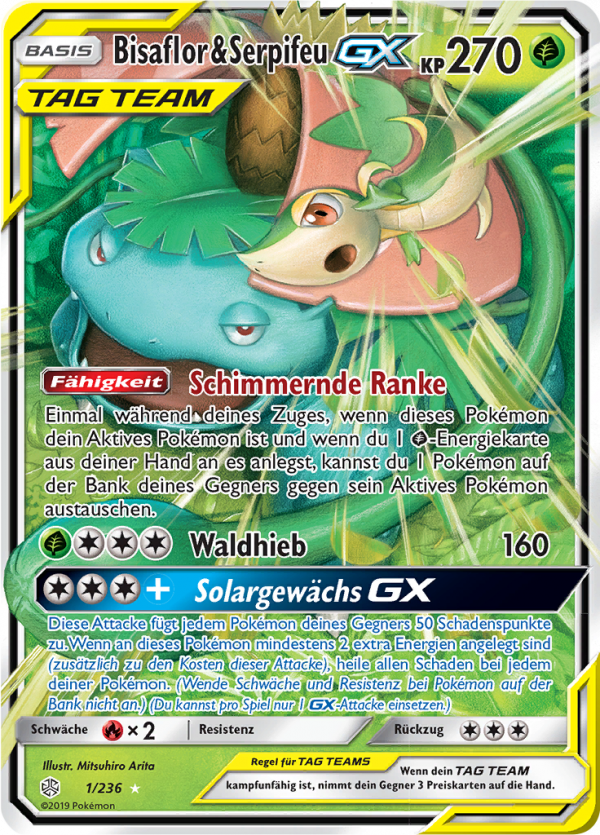 | Kaufen? | Kaufen Sie Ihre Bisaflor & Serpifeu-GX Pokemon-Karte aus dem Welten im Wandel-Erweiterung. |