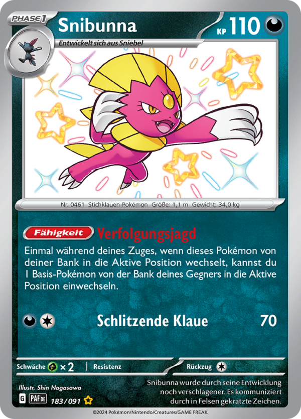 | Kaufen? | Kaufen Sie Ihre Snibunna Pokemon-Karte aus dem Paldeas Schicksale-Erweiterung. |