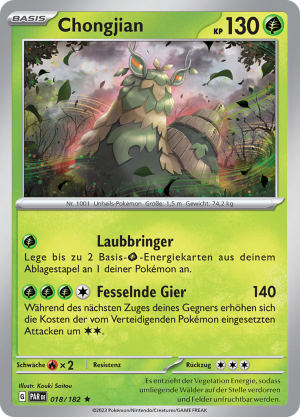 | Kaufen? | Kaufen Sie Ihre Chongjian-ex Pokemon-Karte aus dem Paldeas Schicksale-Erweiterung. |