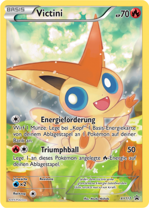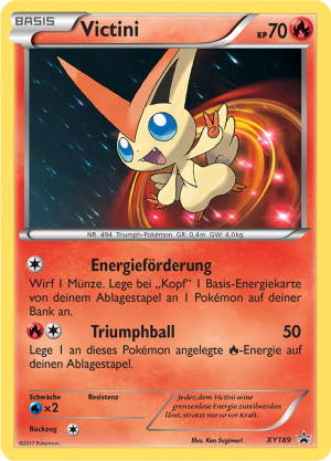 | Fließtext | Ein siegverheißendes Pokémon. Man sagt, Trainer, die ein Victini in ihrem Team haben, seien unschlagbar. |