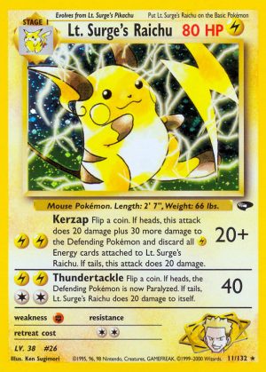 Die Base Set Raichu-Karte ist eine ikonische Karte, die für ihr holografisches Artwork und ihre starke Fähigkeit bekannt ist. Sie hat einen Angriff namens “Agilität”, der nicht nur Schaden verursacht, sondern auch eine Chance hat, alle Effekte von Angriffen, einschließlich Schaden, die Raichu während des nächsten Zuges des Gegners zugefügt werden, zu verhindern. Ihr zweiter Angriff “Donner” ist ein High-Risk-High-Reward-Angriff, der potenziell erheblichen Schaden verursachen kann, aber auch eine Chance hat, Raichu selbst zu schädigen.